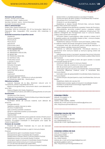 WWW.GHIDULPRIMARIILOR.RO JUDE%u021aUL ALBA / 23Persoane din primarie:Primar: %u00a0Emilia Livia C%u00eendeaViceprimar: Viorel - Vasile AvramSecretar General:%u00a0%u00a0Ioana - Maria GheorgheContabil: Firm%u0103%u00a0externalizat%u0103Sate %u00een administra%u021bie:Do%u015ftat, Boz, Dealul Do%u015ftatuluiSuprafa%u021ba:%u00a0 4015 ha; Intravilan:%u00a0 151, 57 ha; Extravilan:%u00a0 3863,43 ha; Popula%u021bia:%u00a0 984; Gospod%u0103rii:%u00a0 370; Locuin%u021be:%u00a0 470; Gr%u0103dini%u021be:%u00a0 2; %u0218coli:%u00a02; Activitati economice si specifice zonei:ZootehnieCultura cerealelorPomicultur%u0103Piscicultur%u0103Apicultur%u0103Prelucrarea c%u0103rniiPrelucrarea lapteluiFirme reprezentative:SC BIOTERRA SRLSC ABERDEEN ANGUS SRLSC BIOEF SRLSC POMICOLA BOZ SRLSC ROFRUCT SRLProduc%u0103tori locali:I.I Avram C. FlorinBaba CornelStr%u0103ulea GheorgheSecu CristacheProduse locale:Sucuri de m%u0103r %u015fi c%u0103tin%u0103MezeluriLapte prafCompanii reprezentative:SC BIOTERRA SRL - zootehnia %u015fi cultura plantelorSC POMICOLA BOZ SRL - Pomicultur%u0103Obiective turistice:Vulcanii Noroio%u015fi de la Boz, fenomen natural unic %u00een Transilvania, av%u00e2nd o suprafa%u0163%u0103 de 0,5 haBiserica Evanghelic%u0103 Boz, monument istoric care dateaz%u0103 din anul 1524Stejarul Regelui din Dealu Do%u015ftatuluiLacurile de acumulare, care ofer%u0103 un peisaj pitoresc al comuneiEvenimente:S%u0103rb%u0103toarea Fiilor SatuluiFestivalul interjude%u0163ean %u2018%u2019Datin%u0103 Str%u0103bun%u0103 pe Valea Seca%u015felor%u2019%u2019Facilit%u00e3%u0163i oferite investitorilor:Facilit%u0103%u0163ile oferite de comuna noastr%u0103, sunt destule de atractive:Energie electric%u0103Telefonie mobil%u0103, internet %u015fi cabluDrumuri modernizateAp%u0103 curent%u0103 %u015fi posibil%u0103 canalizareSprijin %u00een ob%u0163inerea avizelor %u015fi autoriza%u0163iilorTransparen%u0163%u0103 total%u0103Oportunit%u0103%u0163i:Administra%u0163ia local%u0103 este preocupat%u0103 de crearea infrastructurii necesare pentru cre%u015fterea activit%u0103%u0163ii comunei ca destina%u0163ie turistic%u0103, %u00eencuraj%u00e2nd investi%u0163iile %u00een amenajarea unor spa%u0163ii de cazare %u015fi agrement%u00a0Proiecte de investi%u0163ii:Proiecte de investi%u021bii finalizate sau %u00een curs de execu%u021bie (executat peste 90%):%u00cenfiin%u021bare re%u021bele alimentare cu ap%u0103 %u00een Comuna Do%u0219tatFinalizatBran%u0219amente ap%u0103 %u00een localitatea Do%u0219tat FinalizatBran%u0219amente ap%u0103 %u00een localitatea Boz FinalizatModernizare %u0219i dotare C%u0103min Cultural Do%u0219tat FinalizatReabilitare %u0218coala Gimnazial%u0103 Do%u0219tat FinalizatAmenajare rigole %u0219i trotuare %u00een localitatea Do%u0219tat FinalizatModernizare str%u0103zi %u0219i drumuri %u00een Comuna Do%u0219tat%u00cen curs de execu%u021bie (executat peste 90%)Modernizare iluminat public %u00een Comuna Do%u0219tat FinalizatDotare SVSU cu buldoexcavator %u0219i accesorii FinalizatConstruire teren de sport sintetic %u00een localitatea Boz FinalizatActualizare PUG Comuna Do%u0219tatProiecte %u00een curs de preg%u0103tire:Reabilitare %u0219i dotare %u0218coal%u0103 Primar%u0103 Boz, comuna Do%u0219tat, jude%u021bul Alba Cerere de finan%u021bareRe%u021bea inteligent%u0103 de distribu%u021bie a gazelor Cerere de finan%u021bare%u00cembun%u0103t%u0103%u021birea serviciilor publice pentru cre%u0219terea calit%u0103%u021bii vie%u021bii cet%u0103%u021benilor, prin digitalizare, realizarea infrastructurii TICsisteme inteligente de management local %u00een comuna Do%u0219tat, jude%u021bul Alba Cerere de finan%u021bare%u00cenfiin%u021bare Sistem supraveghere video stradal %u0219i sistem Wi-Fi %u00een spa%u021biile publice din localit%u0103%u021bile Do%u0219tat %u0219i Boz , comuna Do%u0219tat, jude%u021bul Alba Cerere de finan%u021bareReabilitarea sediului Prim%u0103riei Comunei Do%u0219tat, jude%u021bul Alba, %u00een vederea cre%u0219terii eficien%u021bei energetice Cerere de finan%u021bareAmplasare sta%u021bii de re%u00eenc%u0103rcare pentru vehicule electrice %u00een comuna Do%u0219tat, jud.Alba Cerere de finan%u021bareDotarea cu vehicule nepoluante %u2013microbuze electrice, %u00een parteneriat %u00eentre Comuna Do%u0219tat %u015fi Comuna %u0218pring Cerere de finan%u021bareAchizi%u021bionare tractor %u0219i accesorii necesare Serviciului Voluntar pentru Situa%u021bii de Urgen%u021b%u0103 al Comunei Do%u0219tat, jude%u021bul Alba Cerere de finan%u021bareAmenajare curte %u0219coal%u0103 %u0219i teren de sport sintetic la %u0218coala Gimnazial%u0103 Do%u0219tat SF+PTConstruire sal%u0103 de sport %u00een Comuna Do%u0219tat%u00cenfiin%u021bare re%u021bea de canalizare %u00een Comuna Do%u0219tat SFIdei de proiecte pentru perioada 2023-2033Amenajare rigole %u0219i trotuare %u00een localitatea Boz, Comuna Do%u0219tatConstruire dispensar medical uman %u00een localitatea Boz, Comuna Do%u0219tatExtindere re%u021bea de ap%u0103 potabil%u0103 %u00een localitatea Dealu Do%u0219tatului, Comuna Do%u0219tatConstruire parc de joac%u0103 pentru copii, localitatea Boz, Comuna Do%u0219tatReabilitare cl%u0103dire din secolul XIXModernizare accese, rigole %u0219i trotuare %u00een localitatea Do%u0219tat%u00cenvesti%u021bii %u00een proiecte privind energia regenerabil%u0103 Amenajare spa%u021bii verziCOMUNA F%u0102R%u0102UAdres%u0103: Principal%u0103, nr. 70Cod po%u0219tal: 517280Telefon: 0358-408190, 408199; Adresa de e-mail: primariacomuneifarau@yahoo.comURL: http://www.primariafarau.roCOMUNA GALDA DE JOSAdres%u0103: Principal%u0103, nr. 90Cod po%u0219tal: 517285Telefon: 0258-846032, 846101; Fax: 0258-846032 int. 9; Adresa de e-mail: clgalda@yahoo.comCOMUNA G%u00c2RDA DE SUSAdres%u0103: Principal%u0103, nr. 46 ACod po%u0219tal: 517310Telefon: 0258-778141; Fax: 0258-700533; Adresa de e-mail: primariagarda@yahoo.comgardadesus@ab.e-adm.roURL: http://www.primariagardadesus.ro/