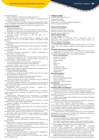 WWW.GHIDULPRIMARIILOR.RO JUDE%u021aUL ARAD / 57german%u0103 matern%u0103Terenuri fertile %u00een vederea practic%u0103rii agriculturiiTerenuri propice dezvolt%u0103rii unor investi%u021bii, cu posibilitatea de a se asigura utilit%u0103%u021bile necesare Prezen%u021ba for%u021bei de munc%u0103 bine calificate %u00een meseriile de sudor, prelucr%u0103ri metalice, t%u00e2mpl%u0103rie, fo%u0219ti angaja%u021bi ai fabricilor de mobil%u0103, uzinei de vagoane, centrului de reparare al motoarelor SMA.Proiecte de investi%u0163ii:PROIECTE FINALIZATEReabilitare imobil Liceul Tehnologic S%u00e2ntana, Jude%u021bul AradReabilitare %u0219i modernizare %u0219coala general%u0103%u00a0Sf. Ana Corp cl%u0103dire Str. Ghioceilor nr. 29/31, Ora%u0219%u00a0S%u00e2ntana, Jude%u021bul%u00a0AradExtindere %u0219coala Gimnazial%u0103 cu sal%u0103 de sport, str. T. Vladimirescu, nr. 25Reabilitare %u0219coala Gimnazial%u0103%u00a0 Sf.Ana cu clasele I-IV, Corp cl%u0103dire Str. Unirii, nr. 3C arondat%u0103%u00a0 Liceului Tehnologic St.Hell S%u00e2ntanaGr%u0103dini%u021ba cu program prelungit Str. Muncii nr. 80, Ora%u0219%u00a0S%u00e2ntana, Jude%u021bul%u00a0AradImproved cross border between public institutions of NadlacSantana-Elek-DobozAmenajare teren de sport multifunc%u021bional, Str. Dun%u0103rii, Ora%u0219%u00a0S%u00e2ntanaCre%u0219terea eficien%u021bei energetice la cl%u0103dirile reziden%u021biale %u00een Ora%u0219ul S%u00e2ntana, Jude%u021bul AradBaz%u0103%u00a0sportiv%u0103%u00a0Caporal AlexaConstruire baz%u0103%u00a0sportiv%u0103%u00a0Tip I Str.Mihai Viteazul, Ora%u0219%u00a0S%u00e2ntanaReabilitarea, modernizarea %u0219i eficientizarea sistemului de iluminat public %u00een Ora%u0219ul S%u00e2ntana, LOT IConstruire %u0219i dotare Centrul Cultural, Ora%u0219%u00a0S%u00e2ntanaAmenajare Ppiste de biciclete %u00een Ora%u0219ul S%u00e2ntanaCre%u0219terea calit%u0103%u021bii vie%u021bii %u00een Ora%u0219ul S%u00e2ntana prin investi%u021bii %u00een regenerarea urban%u0103 a zonei istoriceRestaurarea Urbariall Haus (Casa Urbariala) %u0219i adaptarea ei la nevoile culturale ale comunit%u0103%u021biiPROIECTE %u00ceN IMPLEMENTAREReabilitare %u0219i modernizare %u0218coala Sfanta Ana, corp str. Muncii nr. 56, Ora%u0219 S%u00e2ntana, jude%u021bul%u00a0AradRealizare locuin%u021be colective sociale %u00een ora%u0219ul S%u00e2ntanaAmenajare Parc Europa %u00een ora%u0219ul S%u00e2ntanaSistem centralizat de furnizare a energiei termice, utiliz%u00e2nd energie geotermal%u0103 %u00een ora%u0219ul S%u00e2ntanaCre%u0219terea mobilit%u0103%u021bii urbane %u00een ora%u0219ul S%u00e2ntana prin extinderea re%u021belei de piste de biciclete spre satul apartin%u0103tor Caporal Alexa %u0219i zona industrial%u0103 DJ 791Reabilitarea %u0218colii Gimnaziale Santana %u2013 S%u00e2ntana str. 1 Decembrie, nr. 36 %u2013 jude%u021bul AradConstruirea de locuin%u021be pentru tineri/locuin%u021be de serviciu pentru speciali%u0219tii din s%u0103n%u0103tate %u0219i %u00eenva%u021b%u0103mant %u00een ora%u0219ul S%u00e2ntana, jude%u021bul AradModernizarea infrastructurii de %u00eenva%u021b%u0103mant %u0219i cre%u0219terea eficien%u021bei energetice %u00een cl%u0103dirile publice- Liceul Tehnologic %u0218tefan Hell, corp str. Campului nr. 107%u00cenfiintare centru de aport voluntar pentru de%u0219euri %u00een ora%u0219ul S%u00e2ntana %u0219i satul apartinator Caporal AlexaDotarea unit%u0103%u021bilor de %u00eenva%u021b%u0103mant preuniversitar din ora%u0219ul S%u00e2ntana, Jude%u021bul AradReabilitarea, modernizarea sistemului de iluminat public %u00een ora%u0219ul S%u00e2ntana- etapa 2Modernizare infrastructur%u0103 rutier%u0103 %u0219i pietonal%u0103 zone centrale (str%u0103ziile Muncii, Rodnei %u0219i Mihai Viteazul) %u00een ora%u0219ul S%u00e2ntanaExtindere re%u021bele de canalizare %u00een ora%u0219ul S%u00e2ntana, str. Closca, Grivi%u021ba, Some%u0219ului, Vasile Cucu, Ion Vidu, 8 Martie %u0219i extindere re%u021bea de ap%u0103%u00a0str. Clo%u0219caConstruire %u0219i dotare cre%u0219%u0103 medie %u00een ora%u0219ul S%u00e2ntanaExtindere re%u021bea de alimentare cu ap%u0103 %u00een ora%u0219 S%u00e2ntana, sat Caporal AlexaAlimentarea cu gaze naturale a localit%u0103%u021bii Caporal Alexa%u00cenfiin%u021barea unui sistem de produc%u021bie energie electric%u0103 din surse regenerabile, pe raza UAT S%u00e2ntanaPlatforme comunale de colectare %u0219i valorificare a gunoiului de grajd %u00een satul apar%u021bin%u0103tor Caporal AlexaPROIECTE %u00ceN EVALUARECre%u0219terea eficien%u021bei energetice %u0219i gestionarea inteligent%u0103 a energie %u00een cl%u0103dirile publice, %u0219coala Caporal AlexaRe%u021bea de canalizare menajer%u0103 %u00een Ora%u0219 S%u00e2ntana, sat Caporal Alexa, jude%u021bul AradORA%u0218UL SEBI%u015eAdres%u0103: Pia%u021ba Tineretului, nr. 1Cod po%u0219tal: 315700Telefon: 0257-311008; Adresa de e-mail: primaria@primariasebis.roURL: www.primariasebis.roPersoane din primarie:Primar: Cristian Feie%u015fViceprimar: Marius Remus TurneaSecretar General: Lavinia-Maria S%u00eerbContabil: Adrian-C%u0103lin Ulic%u0103Sate %u00een administra%u021bie:Pruni%u015for, S%u0103l%u0103jeni, DonceniSuprafa%u021ba:%u00a0 6763 ha; Intravilan:%u00a0 987 ha; Extravilan:%u00a0 5776 ha; Popula%u021bia:%u00a0 5410; Gospod%u0103rii:%u00a0 2156; Locuin%u021be:%u00a0 2232; Gr%u0103dini%u021be:%u00a0 4; %u0218coli:%u00a01; Licee:%u00a01; Universita%u021bi:%u00a01; Cum se ajunge in localitate:Pe drumurile jude%u021bene DJ792B %u0219i DJ793, precum %u0219i pe calea ferat%u0103 care face leg%u0103tura Brad-Gurahon%u021b-Sebi%u0219-Ineu-S%u00e2ntanaAradActivitati economice si specifice zonei:Prelucrarea lemnului, fabricare mobilier, prelucrarea pieilor %u0219i confec%u021bionarea articolelor din piele %u0219i blan%u0103, confec%u021bionarea articolelor de %u00eenc%u0103l%u021b%u0103minte, comer%u021b, prest%u0103ri serviciiFirme reprezentative:Minimaxx, AnidoraImpact -ConstructGema SuperbFalcaRaymondArielaIacob Prod-ComManufactura M%u0103guraGeralli, Pielcon