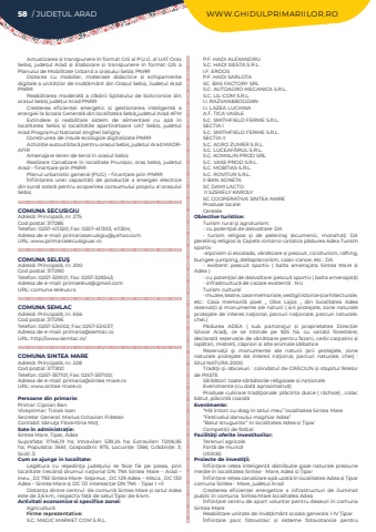 58 / JUDE%u021aUL ARAD WWW.GHIDULPRIMARIILOR.ROActualizarea %u0219i transpunere %u00een format GIS al P.U.G. al UAT Ora%u0219 Sebi%u0219, jude%u021bul Arad %u0219i Elaborare %u0219i transpunere %u00een format GIS a Planului de Mobilitate Urban%u0103 a ora%u0219ului Sebi%u0219 PNRRDotarea cu mobilier, materiale didactice %u0219i echipamente digitale a unit%u0103%u021bilor de %u00eenv%u0103%u021b%u0103m%u00e2nt din Ora%u0219ul Sebi%u0219, Jude%u021bul Arad PNRRReabilitarea moderat%u0103 a cl%u0103dirii Spitalului de bolicronice din ora%u0219ul Sebi%u0219 jude%u021bul Arad PNRRCre%u0219terea eficien%u021bei energetic %u0219i gestionarea inteligent%u0103 a energiei la %u0218coala General%u0103 din localitatea Sebi%u0219,jude%u021bul Arad AFMExtindere %u0219i reabilitare sistem de alimentare cu ap%u0103 %u00een localitatea Sebi%u0219 %u0219i localit%u0103%u021bile apar%u021bin%u0103toare UAT Sebi%u0219, jude%u021bul Arad Programul Na%u021bional Anghel SalignyConstruirea de insule ecologice digitalizate PNRRAchizi%u021bie autoutilitar%u0103 pentru ora%u0219ul Sebi%u0219, jude%u021bul Arad MADRAFIRAmenajare teren de tenis %u00een orasul Sebi%u0219Realizare Canalizare %u00een localitate Pruni%u0219or, ora%u0219%u00a0Sebi%u0219, jude%u021bul Arad %u2013 finan%u021bare prin PNRRPlanul urbanistic general (PUG) %u2013 finan%u021bare prin PNRR %u00cenfiin%u021barea unei capacit%u0103%u021bi de produc%u021bie a energiei electrice din surs%u0103 solar%u0103 pentru acoperirea consumului propriu al ora%u0219ului Sebi%u0219COMUNA SECUSIGIUAdres%u0103: Principal%u0103, nr. 275Cod po%u0219tal: 317285Telefon: 0257-411320; Fax: 0257-411303, 411304; Adresa de e-mail: primariasecusigiu@yahoo.comURL: www.primariasecusigiuar.roCOMUNA SELEU%u015eAdres%u0103: Principal%u0103, nr. 200Cod po%u0219tal: 317290Telefon: 0257-329101; Fax: 0257-329343; Adresa de e-mail: primseleus@gmail.comURL: comuna-seleus.roCOMUNA SEMLACAdres%u0103: Principal%u0103, nr. 656Cod po%u0219tal: 317295Telefon: 0257-534102; Fax: 0257-534137; Adresa de e-mail: primaria@semlac.roURL: http://www.semlac.ro/COMUNA SINTEA MAREAdres%u0103: Principal%u0103, nr. 228Cod po%u0219tal: 317300Telefon: 0257-357101; Fax: 0257-357100; Adresa de e-mail: primaria@sintea-mare.roURL: www.sintea-mare.roPersoane din primarie:Primar: Ciprian BanViceprimar: Troiak IoanSecretar General: Marius Octavian Fr%u0103teanContabil: S%u0103nu%u0163a Florentina Mo%u0163Sate %u00een administra%u021bie:Sintea Mare, %u021aipar, AdeaSuprafa%u021ba:%u00a0 11746,19 ha; Intravilan:%u00a0 539,24 ha; Extravilan:%u00a0 11206,95 ha; Popula%u021bia:%u00a0 3661; Gospod%u0103rii:%u00a0 975; Locuin%u021be:%u00a0 1366; Gr%u0103dini%u021be:%u00a0 3; %u0218coli:%u00a03; Cum se ajunge in localitate:Leg%u0103tura cu re%u015fedin%u0163a jude%u0163ului se face fie pe %u015fosea, prin localitate trec%u00e2nd drumul na%u0163ional DN 79A Sintea Mare %u2013 Arad %u2013 Ineu , DJ 793 Sintea Mare- Sepreus , DC 129 Adea %u2013 Misca , DC 130 Adea %u2013 Sintea Mare %u0219i DC 131 intersec%u021bie DN 79A - %u021aipar I +IIDistan%u021ba dintre centrul%u00a0 de comun%u0103%u00a0Sintea Mare %u0219i satul Adea este de 3,6 km., respectiv fa%u021b%u0103%u00a0de satul %u021aipar de 6 km.Activitati economice si specifice zonei:Agricultur%u0103Firme reprezentative:S.C. MAGIC MARKET COM S.R.L.P.F. HADI ALEXANDRUS.C. HADI SIESTA S.R.L.I.F. ERDOSP.F. HADI SARLOTASC. BAS FACTORY SRLS.C. AUTOAGRO MECANICA S.R.L.S.C. LIL-COM S.R.L.I.I. RAZVAN&BOGDANI.I. LAZEA LUCIANAA.F. TICA VASILES.C. SMITHFIELD FERME S.R.L.SECTIA IS.C. SMITHFIELD FERME S.R.L.SECTIA IIS.C. AGRO ZUMER S.R.L.S.C. LUCEAF%u0102RUL S.R.L.S.C. KOMALIN PROD SRLS.C. VASS PROD S.R.L.S.C. MOBTIAS S.R.L.S.C. ROVITUR S.R.L.II BAN AGNETASC DAMI LACTO%u00a0II SZEKELY KAROLYSC COOPERATIVA SINTEA MAREProduse locale: CerealeObiective turistice:Turism rural %u015fi agroturism:- cu poten%u0163ial de dezvoltare: DA- turism religios %u015fi de pelerinaj (ecumenic, monahal): DA perelinaj religios la Capela romano-catolica p%u0103durea Adea Turism sportiv-alpinism %u0219i escalada, v%u00e2n%u0103toare %u0219i pescuit, cicloturism, rafting, bungee-jumping, deltaplanorism, caiac-canoe, etc.: DA- existent: pescuit sportiv ( balta amenajata Sintea Mare %u0219i Adea )- cu poten%u0163ial de dezvoltare: pescuit sportiv ( balta amenajat%u0103)- infrastructur%u0103%u00a0de cazare existent%u0103%u00a0: NUTurism cultural-%u00a0muzee, teatre, case memoriale, vestigii istorice %u0219i arhitecturale, etc.: Casa memoril%u0103%u00a0 poet %u201e Olos Lajos %u201e din localitatea Adea rezerva%u0163ii %u015fi monumente ale naturii ( arii protejate, zone naturale protejate de interes na%u0163ional, parcuri na%u0163ionale, parcuri naturale, chei.)P%u0103durea ADEA%u00a0 ( sub partonajul %u0219i proprietatea Direc%u021biei Silvice Arad), ce se %u00eentinde pe 925 ha. cu varia%u021bii forestiere, declarat%u0103%u00a0rezerva%u021bie de v%u00e2n%u0103toare pentru fazani, cerbi carpatini %u0219i lop%u0103tari, mistre%u021bi, c%u0103priori %u0219i alte animale s%u0103lbaticeRezerva%u0163ii %u015fi monumente ale naturii (arii protejate, zone naturale protejate de interes na%u0163ional, parcuri naturale, chei) : Situl NATURA 2000.Tradi%u0163ii %u015fi obiceiuri : colindatul de CR%u0102CIUN %u0219i stopitul fetelor de PA%u0218TES%u0103rb%u0103tori: toate s%u0103rb%u0103torile religioase %u0219i na%u021bionaleEvenimente (cu dat%u0103%u00a0aproximativ%u0103)Produse culinare tradi%u0163ionale: pl%u0103cinta dulce ( r%u0103chise) , colac b%u0103tut, pl%u0103cint%u0103%u00a0coard%u0103Evenimente:%u201cM%u0103 %u00eentorc cu drag %u00een satul meu%u201d localitatea Sintea Mare%u201dFestivalul dansului maghiar Adea%u201d%u201cBalul strugurilor%u201d %u00een localitatea Adea %u0219i %u021aiparCompeti%u021bii de fotbalFacilit%u00e3%u0163i oferite investitorilor:Terenuri agricoleFor%u021b%u0103%u00a0de munc%u0103Utilit%u0103%u021biProiecte de investi%u0163ii:%u00cenfiin%u021bare re%u021bea inteligent%u0103%u00a0dist