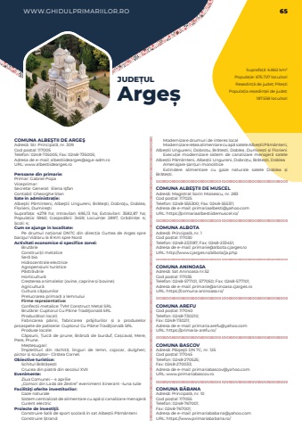 WWW.GHIDULPRIMARIILOR.RO 65Suprafa%u021b%u0103: 6.862 km%u00b2Popula%u021bie: 675.727 locuitoriRe%u0219edin%u021b%u0103 de jude%u021b: Pite%u0219tiPopula%u021bia re%u0219edin%u021bei de jude%u021b: 187.558 locuitoriJUDE%u021aULArge%u0219COMUNA ALBE%u015eTII DE ARGE%u015eAdres%u0103: Str. Principal%u0103, nr. 309Cod po%u0219tal: 117005Telefon: 0248-735005; Fax: 0248-735005; Adresa de e-mail: albestiidearges@ag.e-adm.roURL: www.albestiidearges.roPersoane din primarie:Primar: Gabriel PopaViceprimar:%u00a0Secretar General: %u00a0Elena I%u015ffanContabil: Gheorghe StanSate %u00een administra%u021bie:Albe%u015ftii P%u0103m%u00eenteni, Albe%u015ftii Ungureni, Br%u0103te%u015fti, Dobro%u0163u, Doblea, Florieni, Dumire%u015ftiSuprafa%u021ba:%u00a0 4278 ha; Intravilan:%u00a0 695,13 ha; Extravilan:%u00a0 3582,87 ha; Popula%u021bia:%u00a0 5960; Gospod%u0103rii:%u00a0 3459; Locuin%u021be:%u00a0 2897; Gr%u0103dini%u021be:%u00a0 4; %u0218coli:%u00a04; Cum se ajunge in localitate:Pe drumul na%u021bional DN7C din direc%u021bia Curtea de Arge%u0219 spre barajul Vidraru la 8 Km spre NordActivitati economice si specifice zonei:Brut%u0103rieConstruc%u021bii metaliceSer%u0103 bioHidrocentrale electriceAgropensiuni turisticeP%u0103str%u0103v%u0103rieHorticultur%u0103Cre%u0219terea animalelor (ovine, caprine %u0219i bovine)Agricultur%u0103Cultura c%u0103p%u0219unilorPrelucrarea primar%u0103 a lemnuluiFirme reprezentative:Confec%u021bii metalice: TVM Construct Metal SRLBrut%u0103rie: Cuptorul Cu P%u00e2ine Tradi%u0163ional%u0103 SRLProduc%u0103tori locali:Fabricarea p%u00e2inii, fabricarea pr%u0103jiturilor %u0219i a produselor proaspete de patiserie: Cuptorul Cu P%u00e2ine Tradi%u0163ional%u0103 SRLProduse locale:C%u0103p%u0219uni, %u021auic%u0103 de prune, Br%u00e2nz%u0103 de burduf, Ca%u0219caval, Mere, Pere, Prune.Me%u0219te%u0219ugari: %u00cempletituri din r%u0103chit%u0103, linguri de lemn, cojocar, dulgheri, pictor %u0219i sculptor%u2013 C%u00eerstea Cornel. Obiective turistice:Schitul Br%u0103t%u0103%u0219e%u0219tiCrucea din piatr%u0103 din secolul XVIIEvenimente:Ziua Comunei %u2013 4 aprilie%u201eComori din Lada de Zestre%u201d eveniment itinerant %u2013luna IulieFacilit%u00e3%u0163i oferite investitorilor:Gaze naturaleSistem centralizat de alimentare cu ap%u0103 %u0219i canalizare menajer%u0103Curent electricProiecte de investi%u0163ii:Construire Sal%u0103 de sport %u0219colar%u0103 %u00een sat Albe%u0219tii P%u0103m%u00e2nteniConstruire %u0218trandModernizare drumuri de interes localModernizare re%u021bea alimentare cu ap%u0103 satele Albe%u0219tii P%u0103m%u00e2nteni, Albe%u0219tii Ungureni, Dobro%u021bu, Br%u0103te%u0219ti, Doblea, Dumire%u0219ti %u0219i FlorieniExecu%u021bie modernizare sistem de canalizare menajer%u0103 satele Albe%u0219tii P%u0103m%u00e2nteni, Albe%u0219tii Ungureni, Dobro%u021bu, Br%u0103te%u0219ti, DobleaAmenajare %u0219an%u021buri monolitice Extindere alimentare cu gaze naturale satele Doblea %u0219i Br%u0103te%u0219ti.COMUNA ALBE%u015eTII DE MUSCELAdres%u0103: Magistrat Sorin Moisescu, nr. 283Cod po%u0219tal: 117025Telefon: 0248-555300; Fax: 0248-555311; Adresa de e-mail: primariaalbesti@yahoo.comURL: https://primariaalbestiidemuscel.ro/COMUNA ALBOTAAdres%u0103: Principal%u0103, nr. 1Cod po%u0219tal: 117030Telefon: 0248-233187; Fax: 0248-233451; Adresa de e-mail: primarie@albota.cjarges.roURL: http://www.cjarges.ro/albota/ja.phpCOMUNA ANINOASAAdres%u0103: Sat Aninoasa nr.52Cod po%u0219tal: 117035Telefon: 0248-577101, 577050; Fax: 0248-577101; Adresa de e-mail: primarie@aninoasa.cjarges.roURL: https://comuna-aninoasa.ro/COMUNA AREFUCod po%u0219tal: 117040Telefon: 0248-730210; Fax: 0248-730211; Adresa de e-mail: primaria.arefu@yahoo.comURL: https://primaria-arefu.ro/COMUNA BASCOVAdres%u0103: P%u0103i%u015fe%u015fti DN 7C, nr. 125Cod po%u0219tal: 117045Telefon: 0248-270525; Fax: 0248-270033; Adresa de e-mail: primariabascov@yahoo.comURL: www.primariabascov.roCOMUNA B%u0102BANAAdres%u0103: Principal%u0103, nr. 10Cod po%u0219tal: 117055Telefon: 0248-767001; Fax: 0248-767001; Adresa de e-mail: primariababana@yahoo.comURL: https://www.primariababana.ro/