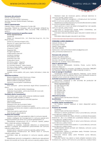 WWW.GHIDULPRIMARIILOR.RO JUDE%u021aUL VASLUI / 733Persoane din primarie:Primar:%u00a0Valerian%u00a0HriscuViceprimar: Gheorghi%u021b%u0103%u00a0%u00a0Dohotariu%u00a0Secretar General: Ionela Mihaela%u00a0Todira%u015fcuContabil:%u00a0Sate %u00een administra%u021bie:Lipov%u0103%u0163, Chi%u0163oc, Corbu, C%u0103pu%u015fneni, Fundu V%u0103iiSuprafa%u021ba:%u00a0 7133,33 ha; Intravilan:%u00a0 405 ha; Extravilan:%u00a0 6728,33 ha; Popula%u021bia:%u00a0 4104; Gospod%u0103rii:%u00a0 1962; Locuin%u021be:%u00a0 1796; Gr%u0103dini%u021be:%u00a0 5; %u0218coli:%u00a05; Activitati economice si specifice zonei:Firme reprezentative:ZootehnieP%u0103s%u0103ri: S.C. Morandi S.R.L , S.C. Prod Ovo Grup S.A , S.C., Pui Prod Ud S.R.L.Ovine: S.C.,Fermacumpana S.R.L.Bovine: S.C. Ignat Agro Farm S.R.L.Cultivarea cerealelorSC Fermacumpana,II Mocanu Tudor,Popprest SRLSC Ignat AgrofarmII Bahnareanu NeculaiConfec%u021bii metaliceAntondalcons SRLAntoTWO-Dan SRLProduc%u0103tori locali:PF Chimu Iulian %u2013 legumePF Gavril Stefan - legumePF Cochilet Catalina %u2013 lapte, branzaPF Honcu Radu Stefan %u2013 Lapte, br%u00e2nz%u0103PFA Vecinu Violeta %u2013 miere de albineProduse locale:Cereale, carne pas%u0103re, vit%u0103, porc, lapte, br%u00e2nzeturi, miere de albineObiective turistice:Biserica Na%u015fterea Maicii Domnului, Chi%u0163ocBiserica Sf%u00e2ntul Niculai, C%u0103p%u0219uneniBiserica Sf%u00e2ntul Gheorghe, Lipov%u0103%u021bCentrul Cultural %u015etefan Ciobot%u0103ra%u015fuEvenimente:Ziua comunei - prima duminic%u0103 dup%u0103 Sfin%u021bii Constantin %u0219i Elena21 Martie - Ziua %u015ecolii %u0218tefan Ciobot%u0103ra%u015fuFestivalul muzicu%u021belor - prima duminic%u0103 din luna iulieV%u0103l%u0103retul - 31 decembrieFacilit%u00e3%u0163i oferite investitorilor:Gaz metan, ap%u0103, canal, asfalt, internet, telefonie mobil%u0103Iluminat public modern cu leduriSal%u0103 sport modern%u0103 pentru activit%u0103%u021bi sportiveOportunit%u0103%u021biZon%u0103 metropolitan%u0103Distan%u021b%u0103 10 km de municipiul VasluiPosibilitatea utiliz%u0103rii transportului publicExisten%u021ba trei ferme de cre%u0219tere a p%u0103s%u0103rilor pentru carne, ou%u0103 %u0219i abatorizareTeren bun pentru agricultur%u0103Sal%u0103 de sport ultramodern%u0103Proiecte de investi%u0163ii:Realizare sistem de supraveghere video %u00een comuna Lipov%u0103%u021bSistem intelligent de management %u00een comuna Lipova%u021b%u00a0 prin integrarea datelor din teren %u00eentr-o solu%u021bie geospa%u021bial%u0103%u00a0G.I.S.Dezvoltarea infrastructurii ITS %u00een comuna Lipov%u0103%u021b jude%u021bul Vaslui. (sta%u021bii de autobuz inteligente)Dotarea cu mobilier, materiale didactice %u0219i echipamente digitale a unit%u0103%u021bilor de %u00eenv%u0103%u021b%u0103m%u00e2nt preuniversitar din comuna Lipov%u0103%u021b, jude%u021bul VasluiDotare c%u0103min cultural %u00een comuna Lipov%u0103%u0163, jude%u021bul VasluiModernizarea infrastructurii de interes local %u00een comuna Lipov%u0103%u021b, jude%u021bul VasluiExtindere re%u021bea de canalizare %u00een comuna Lipov%u0103%u021b, jude%u021bul VasluiReabilitarea termic%u0103 %u0219i energetic%u0103 a obiectivului educa%u021bional %u0218coala Gimnazial%u0103 sat Fundu V%u0103ii, comuna Lipov%u0103%u021b, jude%u021bul VasluiRealizare sta%u021bii de %u00eenc%u0103rcare pentru vehicule electrice %u00een comuna Lipov%u0103%u021b, jude%u021bul VasluiCre%u0219terea eficien%u021bei energetice a infrastructurii de iluminat public %u00een comuna Lipov%u0103%u021b, jude%u021bul VasluiReabilitare %u0219i modernizare drumuri locale afectate de inunda%u021bii %u00een comuna Lipov%u0103%u021b, jude%u021bul VasluiBaz%u0103%u00a0sportiv%u0103%u00a0cu teren de fotbal omologabil tip I sat Lipov%u0103%u021b, comuna Lipov%u0103%u021b, jude%u021bul VasluiDemolare %u0219i reconstruire %u0218coala %u0218tefan Ciobot%u0103r%u0103%u0219u, sat Lipov%u0103%u021b, comuna Lipov%u0103%u021b, jude%u021bul VasluiExtindere re%u021bea de distribu%u021bie gaze naturale %u00een satele Corbu %u0219i ChitocExtindere re%u021bea de gaze naturale %u00een sat ChitocCOMUNA LUNCA BANULUIAdres%u0103: DC34A, nr. 33Cod po%u0219tal: 737340Telefon: 0235-483516; Fax: 0235-483516; Adresa de e-mail: primarialuncabanului@yahoo.comURL: primarialuncabanului.roPersoane din primarie:Primar: ing. D%u0103nu%u0163%u00a0TofanViceprimar: Georgel EnacheSecretar General: Jr. Alina%u00a0Enachi%u00a0Contabil: Ec. Andreea- Elena%u00a0M%u0103r%u0103ndescuSate %u00een administra%u021bie:Lunca Banului, Brosco%u0219e%u0219ti, Condrea, Foc%u0219a, Lunca Veche, O%u021betoaia, R%u0103ducaniSuprafa%u021ba:%u00a08296,84 ha; Intravilan:%u00a0411,0289 ha; Extravilan:%u00a07885,8111 ha; Popula%u021bia:%u00a03298; Gospod%u0103rii:%u00a01258; Gr%u0103dini%u021be:%u00a02; %u0218coli:%u00a04; Cum se ajunge in localitate:Amplasarea satelor Lunca Banului, O%u021betoaia, Lunca Veche situate pe DN 24 pe ruta B%u00e2rlad-F%u0103lciu-Hu%u0219i, faciliteaz%u0103 accesul la celelalte artere rutiere de importan%u021b%u0103 na%u021bional%u0103Activitati economice si specifice zonei:Agricultura, zootehnie %u0219i alte activit%u0103%u021bi de produc%u021bie de dimensiuni mici %u0219i mijlociiFirme reprezentative:SC Zab-Agrocom SRLSC Miluca SRLSC Agrotur SRLSC Drudalin SRLSC Didona SRL SC Salebal SRLObiective turistice:Spa%u021biul Public de Recreere COLACUEvenimente:Ziua Comunei- %u00cenal%u021barea DomnuluiFacilit%u00e3%u0163i oferite investitorilor:Un mediua natural nepoluat %u0219i teren disponibil pentru dezvoltareProiecte de investi%u0163ii:Finalizate:Spa%u021biul Public de Recreere COLACU%u00cenfiin%u021bare %u0219i dotare gradini%u021b%u0103 %u00een satul Lunca Banului, comuna Lunca Banului, jude%u021bul VasluiModernizare DC40 din DN24, DC40A Localitatea Brosco%u0219e%u0219ti, Str%u0103zile Nr.1, 2B, 3, 6 %u0219i DE502 din Localitatea O%u021betoaia, Comuna Lunca Banului, Jude%u021bul VasluiReabilitare dispensar uman %u00een satul Lunca Banului, comuna Lunca Banului, jude%u021bul Vas