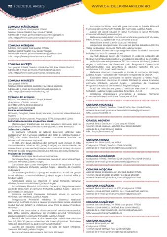 72 / JUDE%u021aUL ARGE%u0218 WWW.GHIDULPRIMARIILOR.ROCOMUNA M%u0102R%u0102CINENIAdres%u0103: nr.274 A; Cod po%u0219tal: 117450Telefon: 0248-278893; Fax: 0248-278893; Adresa de e-mail: primarie@maracineni.cjarges.roURL: https://www.comunamaracineni.ro/COMUNA MERI%u015eANIAdres%u0103: Principal%u0103; Cod po%u0219tal: 117455Telefon: 0248-763201; Fax: 0248-763250; Adresa de e-mail: primariamerisani@yahoo.comURL: https://www.primaria-merisani.ro/COMUNA MICE%u015eTICod po%u0219tal: 117465; Telefon: 0248-234002; Fax: 0248-234002; Adresa de e-mail: primaria.micesti@yahoo.comURL: https://www.comunamicesti.ro/index.phpCOMUNA MIH%u0102E%u015eTICod po%u0219tal: 117470Telefon: 0248-560002, 560005; Fax: 0248-560005; Adresa de e-mail: primarie@mihaesti.cjarges.roURL: https://primaria-mihaesti-ag.ro/Persoane din primarie:Primar: Andreea-Iuliana Cr%u00eempi%u021b%u0103-MateiViceprimar:%u00a0C%u0103t%u0103lin%u00a0%u00a0IstrateSecretar: Zefina Ileana%u00a0BaroanaContabil:%u00a0 Alina%u00a0Cr%u00eempi%u021b%u0103Sate %u00een administra%u021bie:Mihaesti, Draghici, Valea Popii, Vacarea, Furnicosi, Valea Bradului, RudeniSuprafa%u021ba:%u00a034 km patrati; Popula%u021bia:%u00a05772; Gospod%u0103rii:%u00a02240; Activitati economice si specifice zonei:Me%u0219te%u0219uguri tradi%u021bionale pe care locuitorii comunei %u00eenc%u0103 le pratic%u0103 sunt %u00eempletiturile din nuiele %u0219i prelucrarea lemnului.Obiective turistice:%u00cen comuna Mih%u0103e%u015fti se g%u0103sesc bisericile %u201eSf%u00e2ntul Ioan Botez%u0103torul%u201d din Furnico%u015fi (dat%u00e2nd din 1810) %u015fi %u201eSf%u00e2ntul Nicolae%u201d (1767) din Valea Bradului, ambele monumente istorice de arhitectur%u0103 de interes na%u0163ional.%u00cen rest, alte dou%u0103 obiective din comun%u0103 sunt incluse %u00een lista monumentelor istorice din jude%u0163ul Arge%u015f ca monumente de interes local: %u015fcoala veche (%u00eenceputul secolului al XX-lea) din satul Mih%u0103e%u015fti %u015fi casa Iorgulescu (secolul al XIX-lea) din satul Dr%u0103ghiciProiecte de investi%u0163ii:Modernizare re%u021bea de drumuri comunaleConstruire foraj pentru alimentare cu ap%u0103 %u00een satul Valea Popii, comuna Mih%u0103e%u0219ti, jude%u021bul Arge%u0219Canalizare ape uzate menajere %u0219i sta%u021bie de epurare %u00een satul Dr%u0103ghici, comuna Mihpe%u0219ti, jude%u021bul Arge%u0219 %u2013 obiectiv de investi%u021bii %u00een derulareConstruire gradini%u021b%u0103 cu program normal cu 4 s%u0103li de grup%u0103 %u00een sat Mih%u0103e%u0219ti, comuna Mih%u0103e%u0219ti, jude%u021bul Arge%u0219 %u2013 fonduri MEN %u0219i fonduri localeAmenajare Valea lui Marinic%u0103 %u00een satul Mih%u0103e%u0219ti, C%u0103tunul Vl%u0103deni, %u00een comuna Mih%u0103e%u0219ti, jude%u021bul Arge%u0219Actualizarea Planului Urbanistic General %u0219i Regulamentului Local de Urbanism al comunei Mih%u0103e%u0219ti, jude%u021bul Arge%u0219 %u2013 obiectiv de investi%u021bii %u00een derulare%u00cenc%u0103lzire central%u0103 Dispensar Mih%u0103e%u0219ti, situat %u00een comuna Mih%u0103e%u0219ti, sat Mih%u0103e%u0219ti, jude%u021bul Arge%u0219%u00cenregistrarea Prim%u0103riei Mih%u0103e%u0219ti %u00een Sistemul Na%u021bional Electronic de Plat%u0103 on-line a taxelor %u0219i impozitelor locale utiliz%u00e2nd cardul bancar (SNEP) %u0219i instalarea unui POS la sediul Prim%u0103riei Mih%u0103e%u0219tiServicii de %u00eentocmire a documenta%u021biei tehnico-economice, faza DALI, pentru obiectivul de investi%u021bii privind %u201cAmenajare %u0219an%u021buri pereate %u00een comuna Mih%u0103e%u0219ti, jude%u021bul Arge%u0219%u201dServicii de %u00eentocmire a documenta%u021biei tehnico-economice faza SF, PT+DE pentru obiectivul de investi%u021bii privind %u201cExtindere re%u021bea de alimentare cu ap%u0103 %u00een comuna Mih%u0103e%u0219ti%u201dLucr%u0103ri de repara%u021bii exterioare la Sala de Sport Mih%u0103e%u0219ti, comuna Mih%u0103e%u0219ti, jude%u021bul Arge%u0219Servicii arhivare documente Prim%u0103ria Mih%u0103e%u0219tiInstala%u021bie %u00eenc%u0103lzire central%u0103 gaze naturale la %u0218coala Primar%u0103 Furnico%u0219i din comuna Mih%u0103e%u0219ti, sat Furnico%u0219i, jude%u021bul Arge%u0219Locuri de joac%u0103 situate %u00een satul Furnico%u0219i %u0219i satul Mih%u0103e%u0219ti, Comuna Mih%u0103e%u0219ti jude%u021bul Arge%u0219Refacere pode%u021b%u00a0dalat L=4m %u00een satul V%u0103carea, peste ap%u0103%u00a0V%u0103carea, l=8m, h=4m, cu ap%u0103r%u0103ri de mal, amonte %u0219i avalReabilitare anex%u0103 Camin Cultural Mih%u0103e%u0219tiAsigurarea scurgerii apei pluviale pe partea dreapta a DC 314 Valea lui Bugeac, comuna Mih%u0103e%u0219ti, jude%u021bul Arge%u0219Extindere Sistem de supraveghere video la nivelul comunei Mih%u0103e%u0219ti cu %u00eenca 12 camere videoAu fost depuse cereri de finan%u021bare %u00een vederea acces%u0103rii de fonduri nerambursabile pentru umatoarele obiective de investi%u021bii:Achizi%u021bionare echipamente TIC %u00een comuna Mih%u0103e%u0219ti, judetul Arge%u0219 %u2013 solicitare de finan%u021bare prin Programul Opera%u021bional Competitivitate, Axa prioritar%u0103 2, obiectiv specific OS 2.4, Activitatea 2.3.3., Apel de Proiecte 2Refacere drumuri comunale %u0219i locale %u00een comuna Mih%u0103e%u0219ti, jude%u021bul Arge%u0219 %u2013 solicitare de finan%u021bare %u00eenregistrat%u0103 la CNI SAExtindere re%u021bea canalizare %u00een satele V%u0103carea %u0219i Valea Popii, inclusiv racorduri, racorduri %u00een satele Mih%u0103e%u0219ti %u0219i Valea Bradului, comuna Mih%u0103e%u0219ti, judetul Arge%u0219 %u2013 solicitare de finan%u021bare Programul Na%u021bional de Investi%u021bii Anghel SalignySta%u021bii de re%u00eenc%u0103rcare pentru vehicule electrice %u00een comuna Mih%u0103e%u0219ti , jude%u021bul Arge%u0219-solicitare finan%u021bare -A.F.M.Cre%u0219terea eficientiz%u0103rii energetice a sediului Prim%u0103riei Comunei Mih%u0103e%u0219ti- solicitare finan%u021bare -A.F.M.COMUNA MIOARELECod po%u0219tal: 117480; Telefon: 024
