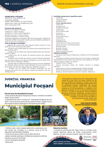 MUNICIPIUL FOC%u015eANIAdres%u0103: Str. Cuza Vod%u0103, Nr. 9ACod po%u0219tal: 620098Telefon: 0237-236000; Fax: 0237-216700; Adresa de e-mail: primarie@focsani.infoURL: www.focsani.infoPersoane din primarie:Primar: Cristi Valentin Mis%u0103il%u0103Viceprimar : Adrian VulpoiuViceprimar :%u00a0Traian Victor NegulescuSecretar General : Carmen Ghiu%u021b%u0103Director economic%u00a0: Carmen GrosuSuprafa%u021ba:%u00a04729,81 ha; Intravilan:%u00a02971,46 ha; Extravilan:%u00a01758,35 ha; Popula%u021bia:%u00a087384; Gospod%u0103rii:%u00a034419; Locuin%u021be:%u00a036620; Gr%u0103dini%u021be:%u00a016; %u0218coli:%u00a08; Licee:%u00a012; Universita%u021bi:%u00a02; Cum se ajunge in localitate:Re%u021beaua de comunica%u021bii este dispus%u0103 radial, accesul %u00een ora%u0219 f%u0103c%u00e2ndu-se prin %u0219ase por%u021bi de intrare:-%u00a0dinspre sud pe E85 (DN2) din direc%u021bia Bucure%u0219ti-Buz%u0103u prin Bariera Bucure%u0219ti-%u00a0dinspre est, pe DN23 din direc%u021bia Br%u0103ila-Gala%u021bi prin Bariera Br%u0103ilei %u0219i Gala%u021bi-%u00a0 dinspre est, pe DJ 204D din direc%u021bia Suraia prin Bariera Gala%u021bi%u2013Suraia-%u00a0dinspre nord, pe E85 din direc%u021bia Suceava%u2013Bac%u0103u-M%u0103r%u0103%u0219e%u0219ti sau Ia%u0219i-Vaslui-Tecuci prin Bariera M%u0103r%u0103%u0219e%u0219ti %u0219i pe DJ 204E %u0219i DJ 209 din direc%u021bia Petre%u0219ti %u0219i V%u00e2n%u0103tori-%u00a0dinspre vest, pe DN2D prin Bariera Drumul Vrancei-Odobe%u0219ti din direc%u021bia T%u00e2rgu Secuiesc%u2013Vidra%u2013Bolote%u0219ti%u2013Drumul Vrancei sau pe DJ 205C din direc%u021bia Vidra-Bolote%u0219ti%u2013Odobe%u0219ti%u2013Foc%u0219ani-%u00a0 dinspre est, pe DN2M din direc%u021bia Andreia%u0219u de jos; dinspre sud, pe DC 141 prin Bariera Cote%u0219ti din direc%u021bia comunei C%u00e2mpineancaActivitati economice si specifice zonei:Vinifica%u021bieIndustrie textil%u0103Industrie fin%u0103Firme reprezentative:Vincon SAVinexport SA Pandora Prod SRLArtifex SRLSimiz Fashion SRLSorste SAMicromet SaProduc%u0103tori locali:Vincon SAVinexport SAProduse locale:Gama de Vinuri %u201dBeciul Domnesc%u201dGama de Vinuri %u201dCramele Jari%u0219tea%u201dBrandy %u201dJade%u201dBrandy %u201dMiori%u021ba%u201dBrandy %u201dJari%u0219tea%u201d Bere artizanal%u0103 %u201dZboina%u201dObiective turistice:Foc%u0219aniul este ora%u0219ul simbolurilor ridicate Unirii Principatelor Romane.Complexul arhitectural din Pia%u021ba Unirii ce include urm%u0103toarele obiective: Borna de Hotar, Monumentul Unirii, Biserica %u201cSf. Ioan%u201d, Ateneul Popular %u201cMaior Gh. Pastia%u201dMuzeul %u201dUnirii%u201d, Foc%u0219aniTeatrul Municipal %u201dMaior Gh. Pastia%u201d, Foc%u0219ani %u0219i Pia%u021beta TeatruluiMonumentul %u201dStatuia Independen%u021bei%u201d Pia%u021beta BaladaSec%u021bia de %u0218tiin%u021be ale naturii Mausoleul Eroilor Foc%u0219aniBiserica %u201eSfin%u021bii %u00cemp%u0103ra%u021bi Constantin %u0218i Elena%u201d (Robescu)768 / JUDE%u021aUL VRANCEA WWW.GHIDULPRIMARIILOR.RO