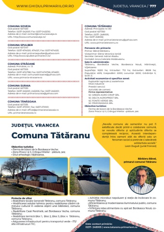 WWW.GHIDULPRIMARIILOR.RO JUDE%u021aUL VRANCEA / 777COMUNA SOVEJACod po%u0219tal: 627320Telefon: 0237-242001; Fax: 0237-242230; Adresa de e-mail: contact@comunasoveja.roURL: http://www.comunasoveja.ro/COMUNA SPULBERCod po%u0219tal: 627247Telefon: 0237-674020, 674021; Fax: 0237-674021; Adresa de e-mail: primariaspulber@yahoo.comURL: http://www.spulber.primarievn.ro/COMUNA STR%u0102OANEAdres%u0103: Prim%u0103riei, nr. 13Cod po%u0219tal: 627325Telefon: 0237-674798; Fax: 0237-674798, 674831; Adresa de e-mail: comunastraoane@yahoo.comURL: www.primaria-straoane.roCOMUNA SURAIACod po%u0219tal: 627330Telefon: 0237-245001, 245005; Fax: 0237-245001; Adresa de e-mail: primaria.suraia@yahoo.comCOMUNA T%u0102N%u0102SOAIACod po%u0219tal: 627335Telefon: 0237-270101; Fax: 0237-270101; Adresa de e-mail: office@primariatanasoaia.roURL: primariatanasoaia.roCOMUNA T%u0102T%u0102RANUAdres%u0103: Principala nr.130Cod po%u0219tal: 627350Telefon: 0237- 248005; Fax: 0237-248332; Adresa de e-mail: primariatataranu@yahoo.comURL: www.primariatataranu.roPersoane din primarie:Primar: B%u0103nel B%u0103rbieruViceprimar: Elena Veronica Ioni%u021b%u0103Secretar General: Adrian BadiuContabil: Anca Gabriela MoldoveanuSate %u00een administra%u021bie:T%u0103t%u0103ranu, Bordeasca Veche, Bordeasca Nou%u0103, M%u0103rtine%u015fti, V%u00eejietoareaSuprafa%u021ba:%u00a0 9220 ha; Intravilan:%u00a0 712 ha; Extravilan:%u00a0 8508 ha; Popula%u021bia:%u00a0 4515; Gospod%u0103rii:%u00a0 2200; Locuin%u021be:%u00a0 2200; Gr%u0103dini%u021be:%u00a0 5; %u0218coli:%u00a02; Activitati economice si specifice zonei:Exploat%u0103ri agricole %u0219i zootehniceMic%u0103 industriePrest%u0103ri serviciiActivit%u0103%u021bi de comer%u021bFirme reprezentative:SC GREEN AGRO CROP SRLSC DELTA AGROPREST SRLSC FONTE VERDE SRL SC FRIZONMAICA SRL Obiective turistice:Ferma de bizoni de la Bordeasca-Veche Zona Proca I %u0219i II, Cr%u00e2ngul Mieilor %u2013p%u0103dure, %u0219es