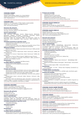 76 / JUDE%u021aUL ARGE%u0218 WWW.GHIDULPRIMARIILOR.ROCOMUNA %u0162I%u0162E%u015eTICod po%u0219tal: 117750Telefon: 0248-299012, 299011; Fax: 0248-299012; Adresa de e-mail: primaria.titesti@yahoo.comURL: http://titesti.roCOMUNA UDA Adres%u0103: nr. 47; Cod po%u0219tal: 117755; Telefon: 0248-243021; Adresa de e-mail: comuna.uda@yahoo.comURL: www.primariauda.roPersoane din primarie:Primar: Dumitru Dr%u0103gu%u0219in%u00a0Secretar General: Valentin Ion Deaconescu%u00a0Contabil: Ioana VasilicaSate %u00een administra%u021bie:Uda, Romana, Brani%u0219tea, Gorani, R%u00eejle%u021bu-Govora, B%u0103r%u0103ne%u015fti, B%u0103dule%u0219ti, S%u0103li%u0219tea, Chiri%u0163e%u015fti, Lungule%u0219ti, Dicone%u0219ti, Dealul Bisericii, Dealu Tolcesei, Cotu, Miercani, Greab%u0103nSuprafa%u021ba:%u00a0 7260 ha; Intravilan:%u00a0 3860 ha; Extravilan:%u00a0 3400 ha; Popula%u021bia:%u00a0 2340; Gospod%u0103rii:%u00a0 1594; Locuin%u021be:%u00a0 1496; Gr%u0103dini%u021be:%u00a0 3; %u0218coli:%u00a03; Activitati economice si specifice zonei:Exploatarea %u015fi cultivarea terenurilor agricoleCre%u015fterea animalelorProfilul economic este unul agricol principalele ramuri fiind cultura cerealelor,pomicultura %u015fi cre%u015fterea animalelorObiective turistice:Biserica cu hramul %u201cAdormirea Maicii Domnului%u201d (1820, pictat%u0103 %u00een 1826) din satul Cotu;Biserica cu hramul %u201cAdormirea Maicii Domnului%u201d (1820) din satul Miercani;Biserica cu hramul %u201cAdormirea Maicii Domnului%u201d (1830) din satul Uda;Biserica cu hramul %u201cBuna Vestire%u201d (1808) din satul Gorani;Biserica cu hramul %u201cCuvioasa Parascheva%u201d (1824, pictat%u0103 %u00een 1828) din satul R%u00e2jle%u0163u-Govora.Evenimente:T%u00e2rg tradi%u0163ional - 15 august de Sf%u00e2nta%u00a0MariaFacilit%u00e3%u0163i oferite investitorilor:Acces la drumurile jude%u0163ene %u015fi comunaleTelefonieElectricitateCl%u0103diri zootehniceProiecte de investi%u0163ii:Alimentare cu ap%u0103 sat Chirite%u0219ti, Comuna Uda, jude%u021bul Arge%u0219Alimentare cu ap%u0103 sat Romana, Comuna Uda, jude%u021bul Arge%u0219Modernizare DC186, Comuna Uda, jude%u021bul Arge%u0219Modernizare drum comunal B%u0103r%u0103ne%u0219ti, Comuna Uda, jude%u021bul Arge%u0219Modernizare drum comunal Valea Satului, Comuna Uda, jude%u021bul Arge%u0219%u00cenfiin%u021bare re%u021bea de distribu%u021bie gaze naturale %u00een comuna Uda, Jude%u021bul Arge%u0219, cu scopul includerii la finan%u021bare %u00een parteneriat cu comunele Cocu, Babana, Cotmeana, %u0219i VedeaCOMUNA UNGHENI Adres%u0103: Principala; Cod po%u0219tal: 117780Telefon: 0248-674063; Fax: 0248-674423; Adresa de e-mail: primariaungheni_ag@yahoo.comPersoane din primarie:Primar: Iulian Miu%u00a0Viceprimar: Ion%u00a0Lic%u0103Contabil: Georgeta%u00a0PopaSate %u00een administra%u021bie:Ungheni, Satu Nou, Col%u0163u, G%u0103ujani, Humele, GoiaSuprafa%u021ba:%u00a0 7500 ha; Intravilan:%u00a0 600 ha; Extravilan:%u00a0 6900 ha; Popula%u021bia:%u00a03654; Gospod%u0103rii:%u00a02200; Locuin%u021be:%u00a03100; Gr%u0103dini%u021be:%u00a05; %u0218coli:%u00a06; Activitati economice si specifice zonei:Cultivarea terenuluiCre%u015fterea animalelorObiective turistice:Schitul GoiaTurism ruralEvenimente:Ziua comunei - %u00een luna iulieFacilit%u00e3%u0163i oferite investitorilor:Spa%u0163ii industriale (construc%u0163ii agrozootehnice)Posibilitatea investirii %u00een agricultur%u0103 %u015fi agroturismProiecte de investi%u0163ii:Alimentare cu ap%u0103Asfaltare drumuri comunaleBaz%u0103 sportiv%u0103 multifunc%u0163ional%u0103Reabilitare %u015fcoal%u0103 general%u0103 %u015fi gr%u0103dini%u0163eModernizare drumuri comunale pe M%u0103sura 125COMUNA VALEA DANULUICod po%u0219tal: 117790Telefon: 0248-724458; Fax: 0248-724458; Adresa de e-mail: primarie@valeadanului.cjarges.roCOMUNA VALEA IA%u015eULUI Cod po%u0219tal: 117795Telefon: 0248-724411; Fax: 0248-724411; Adresa de e-mail: primaria_viasului@yahoo.comURL: www.comunavaleaiasului.roPersoane din primarie:Primar: Cristian EnescuViceprimar: Oliver BucurSecretar General: Nicolae StoicescuContabil:%u00a0Mihail B%u0103rbulescuSate %u00een administra%u021bie:Valea Ia%u015fului, B%u0103dila, B%u0103rb%u0103l%u0103te%u015fti, Borovine%u015fti, Cerbureni, Must%u0103%u0163e%u015fti, Ruginoasa, Ungureni, Valea UleiuluiSuprafa%u021ba:%u00a0 2030 ha; Intravilan:%u00a0 450 ha; Extravilan:%u00a0 1580 ha; Popula%u021bia:%u00a02785; Gospod%u0103rii:%u00a0931; Locuin%u021be:%u00a01102; Gr%u0103dini%u021be:%u00a02; %u0218coli:%u00a02; Activitati economice si specifice zonei:Cre%u015fterea animalelorCultivarea p%u0103m%u00e2ntuluiApicultur%u0103Cultivarea pomilor fructiferiIndustrie alimentar%u0103 (Fabrica Dr. Oetker Ro)Prelucrarea lemnuluiObiective turistice:Biserica ortodox%u0103 %u201cSf%u00e2ntu Ioan Sinzianul%u201d - B%u0103rb%u0103l%u0103te%u015fti 1801 - monument istoricBiserica ortodox%u0103 %u201cSf%u00e2ntu Gheorghe%u201d - Borovine%u015fti - monument istoricBiserica Valea Ia%u015fului 1855 - monument istoricEvenimente:Ziua localit%u0103%u0163ii - 21 mai - %u201cSfin%u0163ii Mari %u00cemp%u0103ra%u0163i Constantin %u015fi maica sa Elena%u201dFacilit%u00e3%u0163i oferite investitorilor:Teren pentru parc industrial cu utilit%u0103%u0163i: ap%u0103, canalizare, gazeProiecte de investi%u0163ii:Construire centru de informare turistic%u0103Reabilitare iluminat public - led-uriConstruire central%u0103 fotovoltaic%u0103 - 2 haAsfaltare 10 km de drumuri comunale %u015fi localeFinalizare canalizare %u00een 5 sateDou%u0103 gr%u0103dini%u0163e cu program prelungit %u00een satele Ungureni %u015fi Must%u0103%u0163e%u015ftiDou%u0103 dispensare umane %u00een satele Ungureni %u015fi Must%u0103%u0163e%u015ftiReabilitarea c%u0103minelor culturale din Valea Ia%u015fului %u015fi Must%u0103%u0163e%u015ftiCOMUNA VALEA MARE PRAV%u0102%u0162Adres%u0103: Bra%u015fovului, nr. 196; Cod po%u0219tal: 117805Telefon: 0248-557112, 557060; Fax: 0248-557112; Adresa de e-mail: primariavaleamarepravat@yahoo.frCOMUNA VED