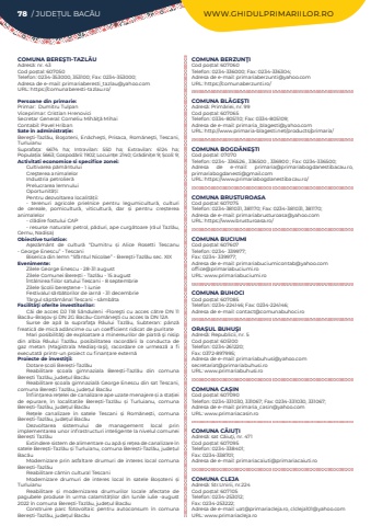 78 / JUDE%u021aUL BAC%u0102U WWW.GHIDULPRIMARIILOR.ROCOMUNA BERE%u015eTI-TAZL%u0102U Adres%u0103: nr. 43Cod po%u0219tal: 607050Telefon: 0234-353000, 353100; Fax: 0234-353000; Adresa de e-mail: primariaberesti_tazlau@yahoo.comURL: https://comunaberesti-tazlau.ro/Persoane din primarie:Primar:%u00a0 Dumitru%u00a0Tulpan%u00a0Viceprimar:%u00a0Cristian%u00a0HrenoviciSecretar General: Corneliu Mih%u0103i%u0163%u0103%u00a0Mihai%u00a0Contabil: Pavel%u00a0Hriban%u00a0Sate %u00een administra%u021bie:Bere%u015fti-Tazl%u0103u, Bo%u015foteni, En%u0103che%u015fti, Prisaca, Rom%u0103ne%u015fti, Tescani, TurluianuSuprafa%u021ba:%u00a0 6674 ha; Intravilan:%u00a0 550 ha; Extravilan:%u00a0 6124 ha; Popula%u021bia:%u00a05663; Gospod%u0103rii:%u00a01902; Locuin%u021be:%u00a02140; Gr%u0103dini%u021be:%u00a09; %u0218coli:%u00a09; Activitati economice si specifice zonei:Cultivarea p%u0103m%u00e2ntuluiCre%u015fterea animalelorIndustria petrolier%u0103Prelucrarea lemnuluiOportunit%u0103%u021bi:Pentru dezvoltarea localit%u0103%u021bii:- terenuri agricole prielnice pentru legumicultur%u0103, culturi de cereale, pomicultur%u0103, viticultur%u0103, dar %u0219i pentru cre%u0219terea animalelor- cl%u0103dire fostului CAP- resurse naturale: petrol, p%u0103duri, ape curg%u0103toare (r%u00e2ul Tazl%u0103u, Cernu, Nadi%u0219a)%u00a0Obiective turistice:A%u015fez%u0103m%u00e2nt de cultur%u0103 %u201cDumitru %u0219i Alice Rosetti Tescanu -%u00a0George Enescu%u201d - TescaniBiserica din lemn %u201cSf%u00e2ntul Nicolae%u201d - Bere%u015fti-Tazl%u0103u sec. XIXEvenimente:Zilele George Enescu - 28-31 augustZilele Comunei Bere%u0219ti - Tazl%u0103u - 15 august%u00cent%u00e2lnirea fiilor satului Tescani - 8 septembrieZilele %u0218colii bere%u015ftene - 1 iunieFestivalul s%u0103rb%u0103torilor de iarn%u0103 - 31 decembrieT%u00e2rgul s%u0103pt%u0103m%u00e2nal Tescani - s%u00e2mb%u0103taFacilit%u00e3%u0163i oferite investitorilor:C%u0103i de acces DJ 118 S%u0103nduleni -Flore%u015fti cu acces c%u0103tre DN 11 Bac%u0103u-Bra%u015fov %u015fi DN 2G Bac%u0103u-Com%u0103ne%u015fti cu acces la DN 12ASurse de ap%u0103 la suprafa%u0163a R%u00e2ului Tazl%u0103u, Subteran: p%u00e2nz%u0103 freatic%u0103 de mic%u0103 ad%u00e2ncime cu un coefficient ridicat de puritateMari posibilit%u0103%u0163i de exploatare a minereurilor de piatr%u0103 %u015fi nisip din albia R%u00e2ului Tazl%u0103u. posibilitatea racord%u0103rii la conducta de gaz metan (Magistrala Media%u015f-Ia%u015fi), racordare ce urmeaz%u0103 a fi executat%u0103 printr-un proiect cu finan%u021bare extern%u0103Proiecte de investi%u0163ii:Dotare %u0219coli Bere%u0219ti-Tazl%u0103uReabilitare %u0219coala gimnaziala Bere%u0219ti-Tazl%u0103u din comuna Bere%u0219ti Tazl%u0103u, jude%u021bul Bac%u0103uReabilitare %u0219coala gimnazial%u0103%u00a0George Enescu din sat Tescani, comuna Bere%u0219ti Tazl%u0103u, jude%u021bul Bac%u0103u%u00cenfiin%u021barea re%u021belei de canalizare ape uzate menajere %u0219i a sta%u021biei de epurare, %u00een localitatile Bere%u0219ti-Tazl%u0103u %u0219i Turluianu, comuna Bere%u0219ti-Tazl%u0103u, jude%u021bul Bac%u0103uRe%u021bele canalizare %u00een satele Tescani %u0219i Rom%u0103ne%u0219ti, comuna Bere%u0219ti-Tazl%u0103u, jude%u021bul Bac%u0103uDezvoltarea sistemului de management local prin implementarea unor infrastructuri inteligente la nivelul comunei Bere%u0219ti Tazl%u0103uExtindere sistem de alimentare cu ap%u0103%u00a0%u0219i re%u021bea de canalizare %u00een satele Bere%u0219ti-Tazl%u0103u %u0219i Turluianu, comuna Bere%u0219ti-Tazl%u0103u, jude%u021bul Bac%u0103uModernizare prin asfaltare drumuri de interes local comuna Bere%u0219ti-Tazl%u0103uReabilitare c%u0103min cultural TescaniModernizare drumuri de interes local %u00een satele Bo%u0219oteni %u0219i TurluianuReabilitare %u0219i modernizarea drumurilor locale afectate de pagubele produse %u00een urma calamit%u0103%u021bilor din lunile iulie -august 2022 %u00een comuna Bere%u0219ti-Tazl%u0103u, jude%u021bul Bac%u0103u Construire parc fotovoltaic pentru autoconsum %u00een comuna Bere%u0219ti-Tazl%u0103u, jude%u021bul Bac%u0103uCOMUNA BERZUN%u0162ICod po%u0219tal: 607060Telefon: 0234-336000; Fax: 0234-336304; Adresa de e-mail: primariaberzunti@yahoo.comURL: https://comunaberzunti.ro/COMUNA BL%u0102GE%u015eTIAdres%u0103: Prim%u0103riei, nr. 99Cod po%u0219tal: 607065Telefon: 0334-805110; Fax: 0334-805109; Adresa de e-mail: primaria_blagesti@yahoo.comURL: http://www.primaria-blagesti.net/products/primaria/COMUNA BOGD%u0102NE%u015eTICod po%u0219tal: 07070Telefon: 0234- 336526 , 336500 , 336900 ; Fax: 0234-336500; Adresa de e-mail: primaria@primariabogdanestibacau.ro, primariabogdanesti@gmail.comURL: https://www.primariabogdanestibacau.ro/COMUNA BRUSTUROASACod po%u0219tal: 607075Telefon: 0234-381031, 381170; Fax: 0234-381031, 381170; Adresa de e-mail: primariabrusturoasa@yahoo.comURL: https://www.brusturoasa.ro/COMUNA BUCIUMICod po%u0219tal: 607607Telefon: 0234- 339977; Fax: 0234- 339977; Adresa de e-mail: primariabuciumicontab@yahoo.comoffice@primariabuciumi.roURL: www.primariabuciumi.roCOMUNA BUHOCICod po%u0219tal: 607085Telefon: 0234-224146; Fax: 0234-224146; Adresa de e-mail: contact@comunabuhoci.roORA%u0218UL BUHU%u015eIAdres%u0103: Republicii, nr. 5Cod po%u0219tal: 605100Telefon: 0234-261220; Fax: 0372-897995; Adresa de e-mail: primariabuhusi@yahoo.comsecretariat@primariabuhusi.roURL: www.primariabuhusi.roCOMUNA CA%u0218INCod po%u0219tal: 607090Telefon: 0234-331030, 331067; Fax: 0234-331030, 331067; Adresa de e-mail: primaria_casin@yahoo.comURL: www.primariacasin.roCOMUNA C%u0102IU%u0162IAdres%u0103: sat C%u0103iu%u0163i, nr. 471Cod po%u0219tal: 607095Telefon: 0234-338401; Fax: 0234-338701; Adresa de e-mail: primariacaiuti@primariacaiuti.roCOMUNA CLEJAAdres%u0103: Str.Unirii, nr.224Cod po%u0219tal: 607105Telefon: 0234-253012; Fax: 0234-253222; Adresa de e-mail: uat@primariacleja.ro, clcleja101@yahoo.comURL: www.primariacleja.ro