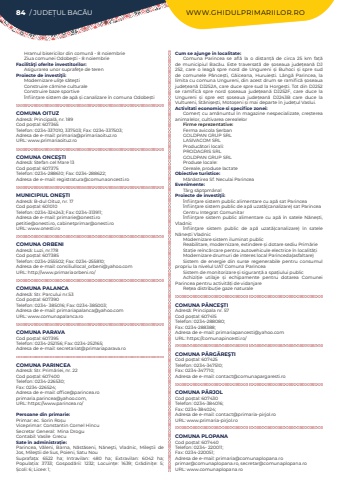 84 / JUDE%u021aUL BAC%u0102U WWW.GHIDULPRIMARIILOR.ROHramul bisericilor din comun%u0103 - 8 noiembrieZiua comunei Odobe%u015fti - 8 noiembrieFacilit%u00e3%u0163i oferite investitorilor:Asigurarea unor suprafe%u0163e de terenProiecte de investi%u0163ii:Modernizare uli%u0163e s%u0103te%u015ftiConstruire c%u0103mine culturaleConstruire baze sportive%u00cenfiin%u021bare sistem de ap%u0103 %u0219i canalizare %u00een comuna Odobe%u0219tiCOMUNA OITUZAdres%u0103: Principal%u0103, nr. 189Cod po%u0219tal: 607365Telefon: 0234-337010, 337503; Fax: 0234-337503; Adresa de e-mail: primaria@primariaoituz.roURL: www.primariaoituz.roCOMUNA ONCE%u015eTIAdres%u0103: Stefan cel Mare 13Cod po%u0219tal: 607375Telefon: 0234-288610; Fax: 0234-288622; Adresa de e-mail: registratura@comunaoncesti.roMUNICIPIUL ONE%u015eTIAdres%u0103: B-dul Oituz, nr. 17Cod po%u0219tal: 601010Telefon: 0234-324243; Fax: 0234-313911; Adresa de e-mail: primarie@onesti.ropetitie@onesti.ro, cabinetprimar@onesti.roURL: www.onesti.roCOMUNA ORBENIAdres%u0103: Luzi, nr.178Cod po%u0219tal: 607385Telefon: 0234-255502; Fax: 0234-255810; Adresa de e-mail: consiliullocal_orbeni@yahoo.comURL: http://www.primariaorbeni.ro/COMUNA PALANCAAdres%u0103: Str. Parcului nr.53Cod po%u0219tal: 607390Telefon: 0234- 385016; Fax: 0234-385003; Adresa de e-mail: primariapalanca@yahoo.comURL: www.comunapalanca.roCOMUNA PARAVACod po%u0219tal: 607395Telefon: 0234-252156; Fax: 0234-252165; Adresa de e-mail: secretariat@primariaparava.roCOMUNA PARINCEAAdres%u0103: Str. Prim%u0103riei, nr. 22Cod po%u0219tal: 607400Telefon: 0234-226530; Fax: 0234-226524; Adresa de e-mail: office@parincea.roprimaria.parincea@yahoo.com,URL: https://www.parincea.ro/Persoane din primarie:Primar: ec. Sorin%u00a0Ro%u0219uViceprimar: Constantin Cornel%u00a0H%u00eencu%u00a0Secretar General:%u00a0 Mina%u00a0DroguContabil: Vasile%u00a0%u00a0GrecuSate %u00een administra%u021bie:Parincea, V%u0103leni, Barna, N%u0103st%u0103seni, N%u0103ne%u015fti, Vladnic, Mile%u015ftii de Jos, Mile%u015ftii de Sus, Poieni, Satu NouSuprafa%u021ba:%u00a0 6522 ha; Intravilan:%u00a0 480 ha; Extravilan:%u00a0 6042 ha; Popula%u021bia:%u00a0 3733; Gospod%u0103rii:%u00a0 1232; Locuin%u021be:%u00a0 1639; Gr%u0103dini%u021be:%u00a0 5; %u0218coli:%u00a06; Licee:%u00a01; Cum se ajunge in localitate:Comuna Parincea se afl%u0103 la o distan%u021b%u0103 de circa 25 km fa%u021b%u0103 de municipiul Bac%u0103u. Este traversat%u0103 de %u0219oseaua jude%u021bean%u0103 DJ 252, care o leag%u0103 spre nord de Ungureni %u0219i Buhoci %u0219i spre sud de comunele P%u00e2nce%u0219ti, G%u0103iceana, Huruie%u0219ti. L%u00e2ng%u0103 Parincea, la limita cu comuna Ungureni, din acest drum se ramific%u0103 %u0219oseaua jude%u021bean%u0103 DJ252A, care duce spre sud la Horge%u0219ti. Tot din DJ252 se ramific%u0103 spre nord %u0219oseaua jude%u021bean%u0103 DJ252F, care duce la Ungureni %u0219i spre est %u0219oseaua jude%u021bean%u0103 DJ243B care duce la Vultureni, St%u0103ni%u0219e%u0219ti, Moto%u0219eni %u0219i mai departe %u00een jude%u021bul Vaslui.Activitati economice si specifice zonei:Comer%u021b cu am%u0103nuntul %u00een magazine nespecializate, cre%u0219terea animalelor, cultivarea cerealelorFirme reprezentative:Ferma avicola %u0218erbanGOLDPAN GRUP SRLLASIVACOM SRLProduc%u0103tori locali:PRODAGRIS SRLGOLDPAN GRUP SRLProduse locale: Cereale, produse lactateObiective turistice:M%u0103n%u0103stirea Sf. Neculai ParinceaEvenimente:T%u00e2rg s%u0103ptpm%u00e2nalProiecte de investi%u0163ii:%u00cenfiin%u0163are sistem public alimentare cu ap%u0103 sat Parincea%u00cenfiin%u0163are sistem public de ap%u0103%u00a0uzat%u0103(canalizare) sat Parincea Centru Integrat Comunitar%u00cenfiin%u0163are sistem public alimentare cu ap%u0103 %u00een satele N%u0103ne%u0219ti, Vladnic%u00cenfiin%u0163are sistem public de ap%u0103%u00a0 uzat%u0103(canalizare) %u00een satele N%u0103ne%u0219ti VladnicModernizare sistem iluminat publicReabilitare, modernizare, extindere %u0219i dotare sediu Prim%u0103rieSta%u021bie re%u00eenc%u0103rcare pentru autovehicule electrice %u00een localit%u0103%u021biModernizare drumuri de interes local Parinceda(asfaltare)Sistem de energie din surse regenerabile pentru%u00a0 consumul propriu la nivelul UAT Comuna ParinceaSistem de monitorizare %u0219i siguran%u021b%u0103 a spa%u021biului publicAchizi%u021bie utilaje %u0219i echipamente pentru%u00a0 dotarea Comunei Parincea pentru%u00a0activit%u0103%u021bi de vidanjareRe%u021bea distribu%u021bie gaze naturaleCOMUNA P%u00c2NCE%u015eTIAdres%u0103: Principala nr. 57Cod po%u0219tal: 607415Telefon: 0234-288080; Fax: 0234-288388; Adresa de e-mail: primariapancesti@yahoo.comURL: https://comunapincesti.ro/COMUNA P%u00c2RG%u0102RE%u015eTICod po%u0219tal: 607425Telefon: 0234-347510; Fax: 0234-347710; Adresa de e-mail: contact@comunapargaresti.roCOMUNA P%u00c2RJOLCod po%u0219tal: 607430Telefon: 0234-384016; Fax: 0234-384024; Adresa de e-mail: contact@primaria-pirjol.roURL: www.primaria-pirjol.roCOMUNA PLOPANACod po%u0219tal: 607440Telefon: 0234- 220011; Fax: 0234-220051; Adresa de e-mail: primaria@comunaplopana.roprimar@comunaplopana.ro, secretar@comunaplopana.roURL: www.comunaplopana.ro